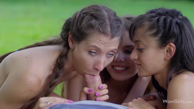 Порно видео: Три молодые милашки по очереди сосут член парня на природе
